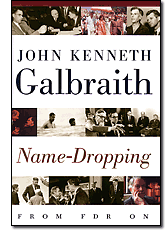 As a member of the Massachusetts delegation, Galbraith came into this picture, I think now, by giving interviews to TV newsmen about the Kennedy boom. Or perhaps to comment on Stevenson's prospects, or on the party platform. In any event, here, to my wondering pre-teen eyes, was a grown-up who spoke ironically and with wit on matters that grown-ups usually made into occasions of pomposity. He also had a stylish way with the sentence, saying aloud things that I had only read in books -- "Of this we will hear more later," for example. Satiric hints lay just below the surface then, and the same is still true forty-five years later, in Name-Dropping: From FDR On. Joseph Kennedy Sr., for example, was objectionable in some eyes, Galbraith writes, for his "unduly talented money-making." An account of FDR's appointments includes a touch of levity: "Lurking always in the neighborhood of the White House was the highly available Bernard Baruch."