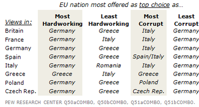One can see the persistence of stereotypes about Greece in the debate today. Many Greeks protest that they are unfairly portrayed as lazy and greedy, particularly in the German media, where Greek demands for debt relief have been met with derision. (French economist Thomas Piketty has cheekily pointed out that Germany’s position is hypocritical, since it has been a major beneficiary of international debt relief.) Past Pew surveys of Europeans have found that while almost all Europeans believe that the Germans are the hardest-working and least-corrupt nation in the EU, a majority think the Greeks are the laziest, which is the sort of impression that—true or not—might prejudice European negotiators in discussion with Greece. Germans sometimes protest that the Greeks share the same stereotypes, but the same Pew numbers show Greeks think they’re the hardest-working. (To their credit, they recognize that they are dangerously corrupt.)