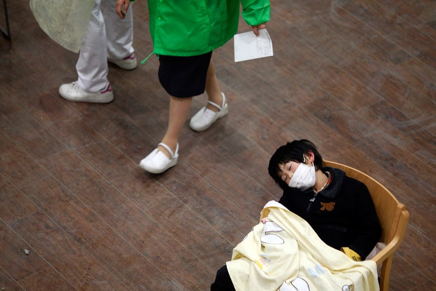 Read moreJapanese refugees rest inside a school gymnasium where hundreds took shelter in Sendai, northeastern Japan, on Monday, March 14, 2011 following Friday\'s massive earthquake and the ensuing tsunami. #
