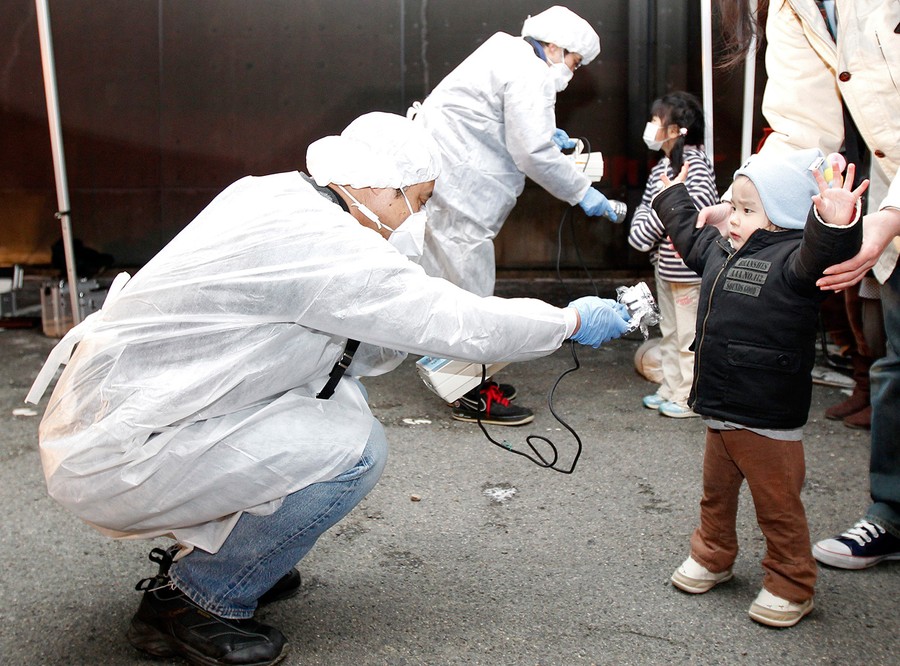 Read moreOfficials in protective gear check for signs of radiation on children who are from the evacuation area near the Fukushima Daini nuclear plant in Koriyama, March 13, 2011. Japanese Chief Cabinet Secretary Yukio Edano confirmed on Saturday there has been an explosion and radiation leakage at Tokyo Electric Power Co\'s (TEPCO) Fukushima Daiichi nuclear power plant. #