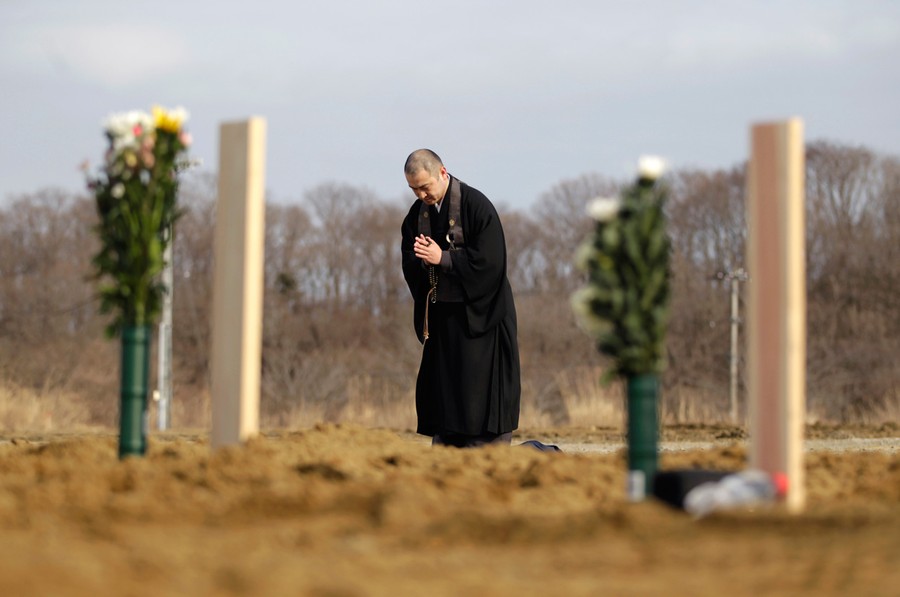 Read moreA bereaved family member of a victim of the earthquake and tsunami prays in front of a coffin at a temporary mass grave site in Higashi-Matsushima, in Miyagi prefecture, northern Japan March 24, 2011. #