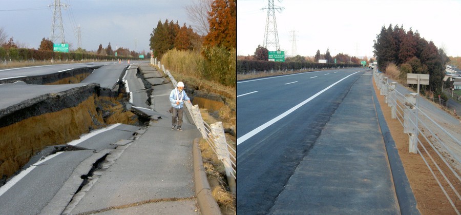 Read moreThese two photos show a road devastated by March 11 massive earthquake (left) and the same road after restoration in Naka, Japan. The highway company restored the 150-meter section of the highway linking Tokyo and the quake-damaged Ibaraki prefecture in six days. The photos were taken on March 11, 2011, left, and on March 17, 2011, right. #