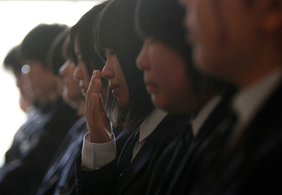 Read moreMachiko Shimizu, a graduate from Okirai Junior High School, wipes her tears during a graduation ceremony at Okirai Kindergarten at Okirai district in Ofunato March 23, 2011. Classes stopped when the junior high school was hit by the March 11 tsunami. Students were kept away when it was used as a temporary morgue for earthquake and tsunami victims. On Wednesday, the students returned for a simple graduation ceremony held for 10 boys and 19 girls. #