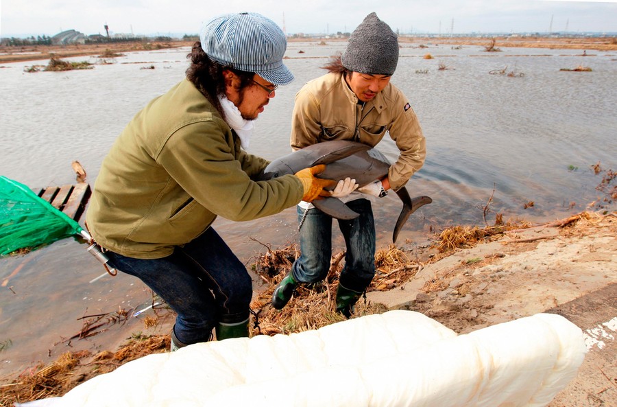 Read moreRyo Taira (right) and an unidentified man lift a young porpoise out of a flooded rice field after it was swept there by the earlier tsunami in Sendai, Japan, on March 22, 2011. Taira found the porpoise struggling in the shallow water on Tuesday and after failing to net it, waded in to the field, which had yet to be sown with rice, to cradle the animal in his arms. #