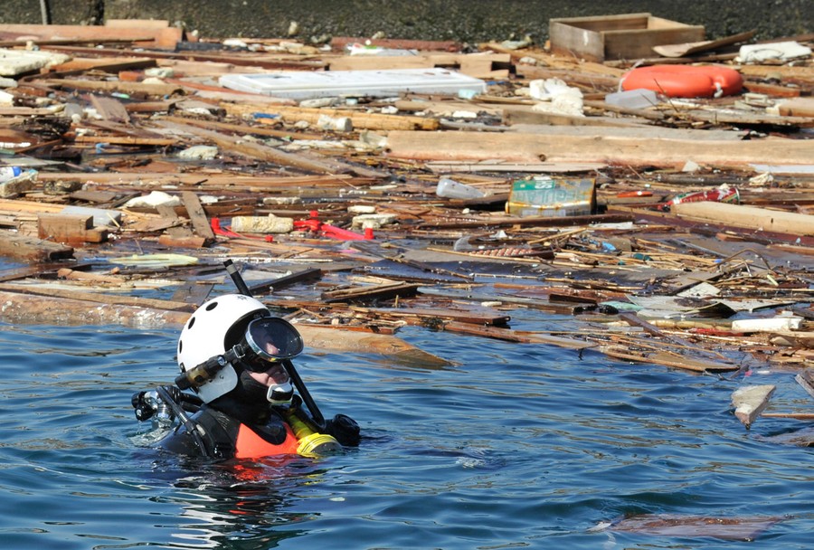 Two weeks after northeastern Japan was struck by a massive earthquake and tsunami, the cost of the disaster is becoming clearer. The Japanese government has estimated the direct damage at as much as $310 billion, making it the world's costliest-ever natural disaster. As of today, more than 10,000 deaths have been confirmed and another 17,000 people remain missing. At Japan's stricken Fukushima Daiichi nuclear power plant, it raised suspicions of a possible breach when two workers waded into water 10,000 times more radioactive than normal and suffered skin burns. Earthquake survivors return to their homes to collect what they can find, to mourn their losses, and try to find a sense of normalcy in lives that have been ripped apart. Collected here are recent images from northeastern Japan, 14 days after it was rocked by disaster on a historic scale.