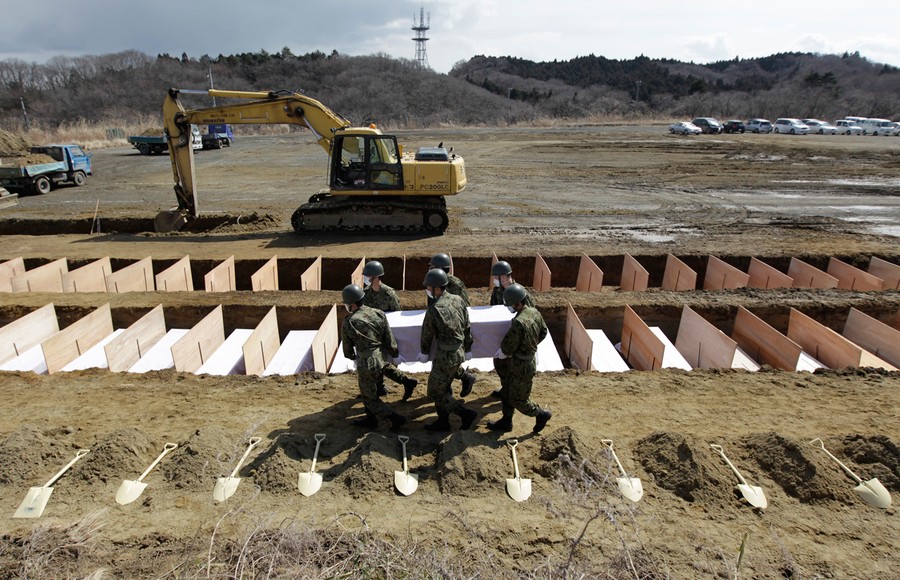 Read moreMembers of the Japan Ground Self Defense Force carry the coffin of a victim of the earthquake and tsunami at a temporary mass grave site in Higashi Matsushima, northern Japan on March 23, 2011. Twenty-four bodies were buried temporarily on Tuesday and more are expected due to the lack of facilities to cremate bodies in the city. The site will be excavated to accommodate around 1,000 bodies in total. #