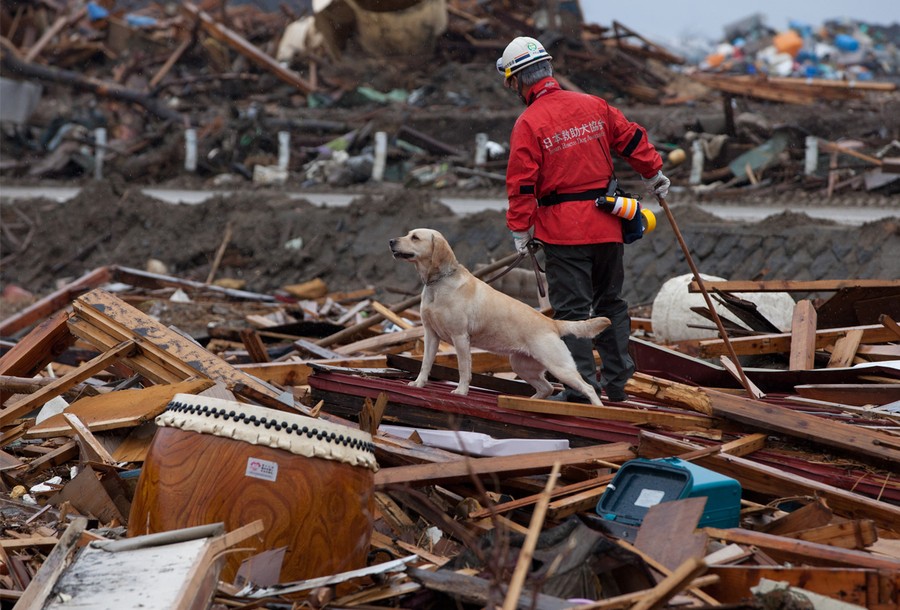 Read moreA team member from NPO Japan Rescue Dog Association and his dog search for victims during a joint operation with the Metropolitan Police Department in Rikuzentakata, Miyagi prefecture on April 9, 2011. #