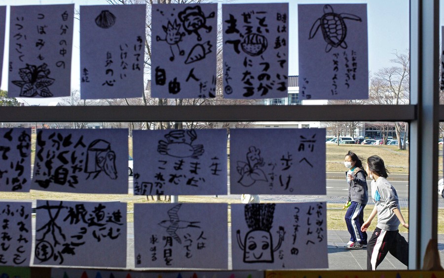 Read moreJapanese children walk by children's "pep up" paintings displayed on a window of a tsunami evacuation center in Sendai, Miyagi Prefecture, Japan, Wednesday, April 13, 2011. Some read: "Walk forward," "Be kind to others and hard on yourself," and "Even a bud inside myself will bloom someday." #