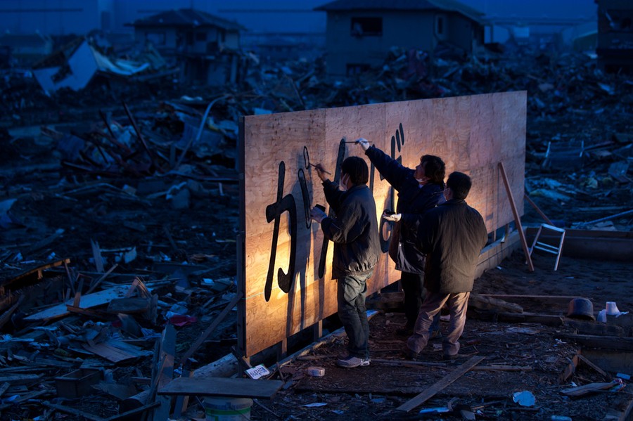 Read moreTsunami survivor Kenichi Kurosawa (center) and his friends write the words "Ganbaro!" or "hang in there" on a new billboard lit up with car headlights in Ishinomaki, Miyagi prefecture on April 10, 2011. #