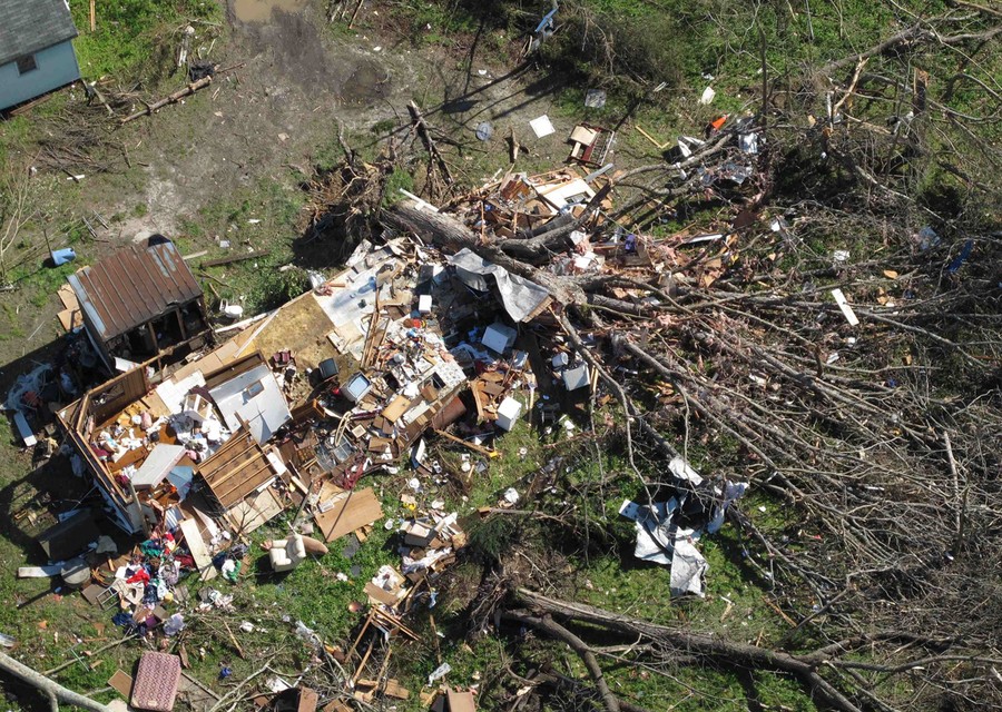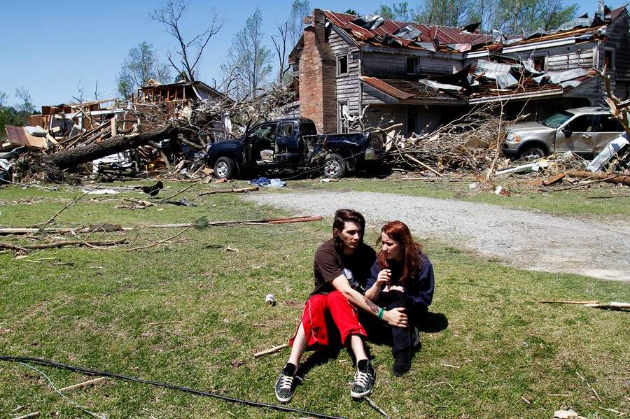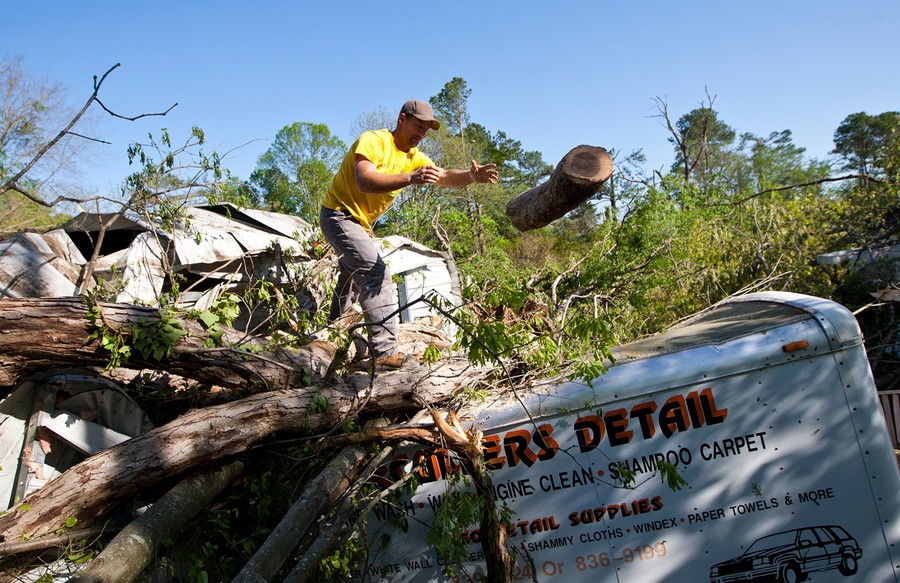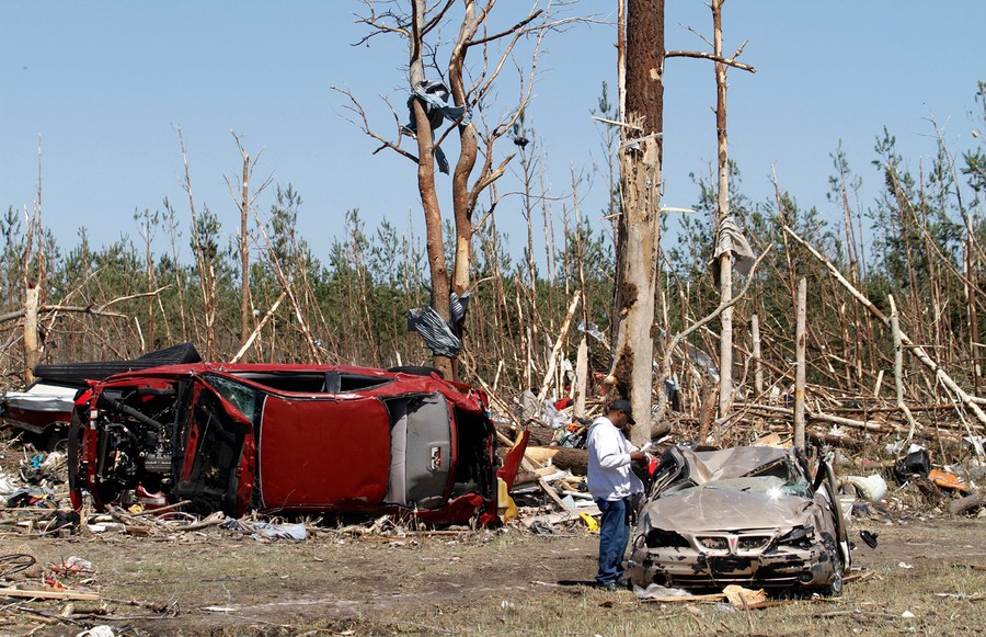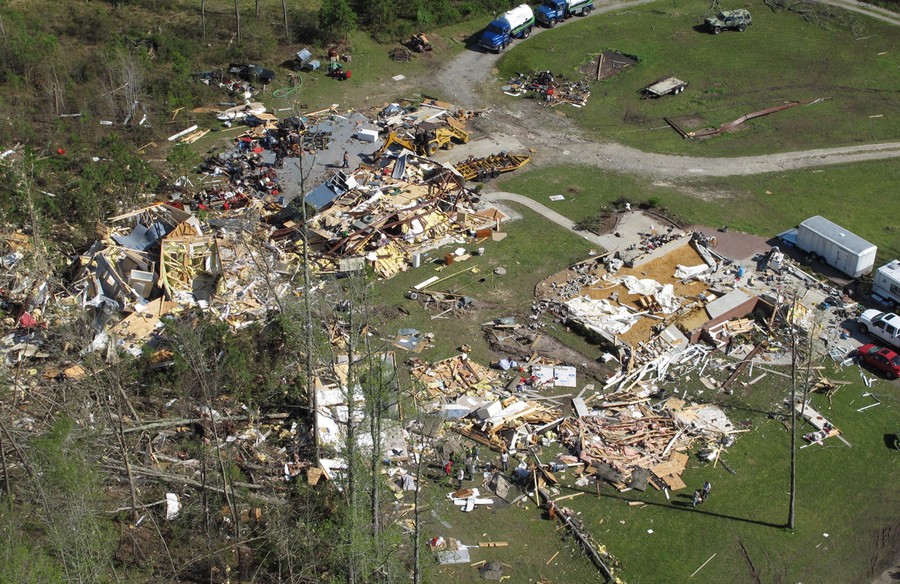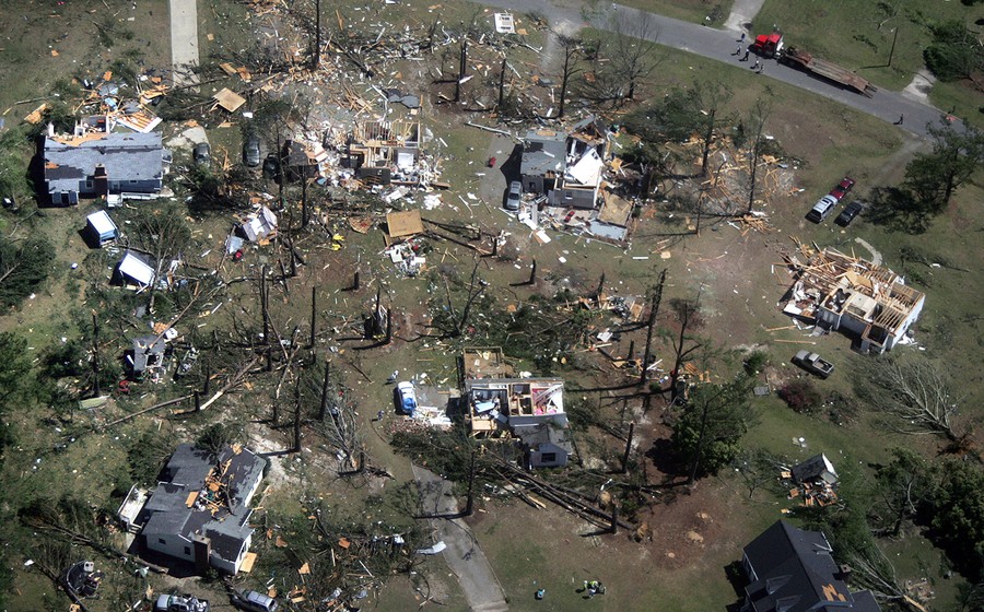 A powerful storm system that started in Oklahoma last Thursday blew through the southern United States over the weekend, spawning nearly 250 reported tornadoes, damaging thousands of structures, and claiming at least 45 lives across six states. Parts of North Carolina were particularly hard-hit by at least 60 tornadoes -- one of which destroyed a Lowe's hardware store with more than 100 employees and customers inside, all of whom survived. The storm system also brought flash flooding and large hailstorms, damaging roads, downing power lines and cell-phone towers, and hampering rescue and clean-up efforts. Gathered here are images of the destruction.