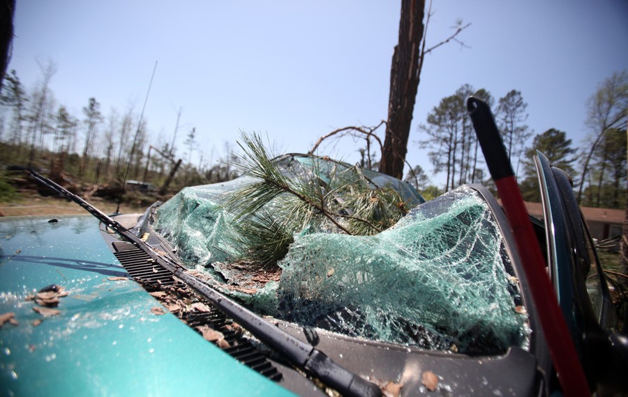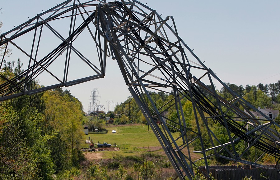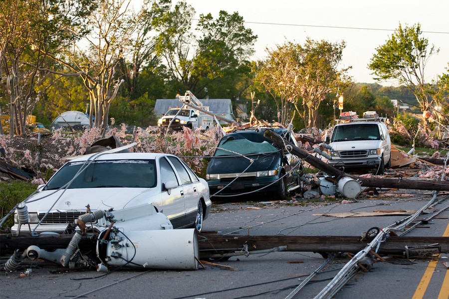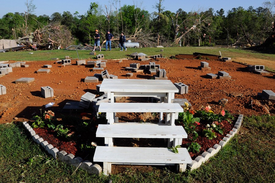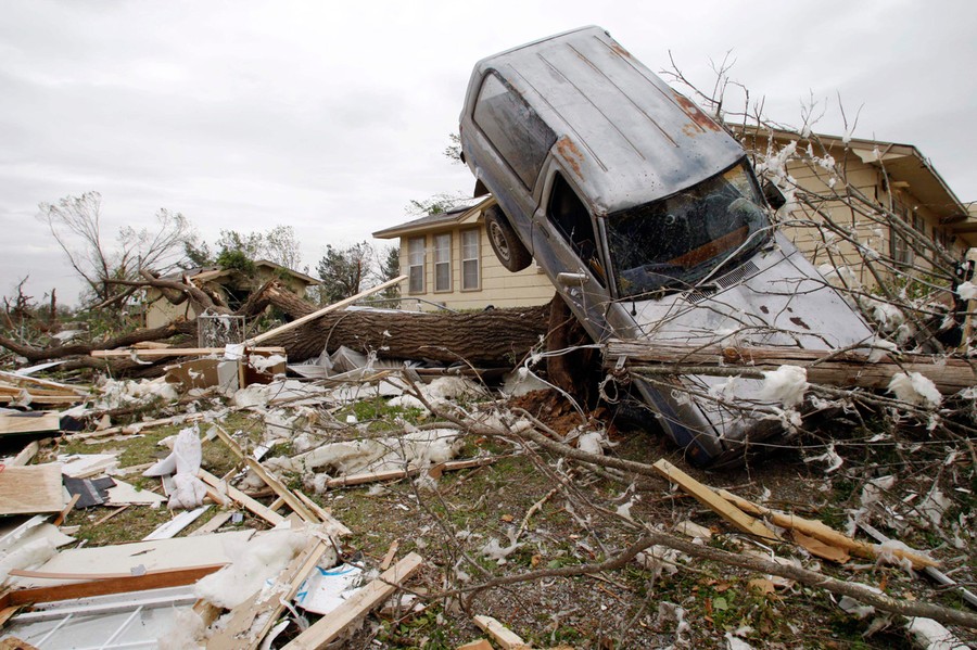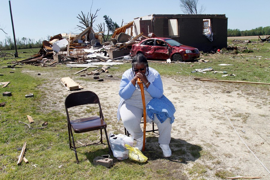 A powerful storm system that started in Oklahoma last Thursday blew through the southern United States over the weekend, spawning nearly 250 reported tornadoes, damaging thousands of structures, and claiming at least 45 lives across six states. Parts of North Carolina were particularly hard-hit by at least 60 tornadoes -- one of which destroyed a Lowe's hardware store with more than 100 employees and customers inside, all of whom survived. The storm system also brought flash flooding and large hailstorms, damaging roads, downing power lines and cell-phone towers, and hampering rescue and clean-up efforts. Gathered here are images of the destruction.