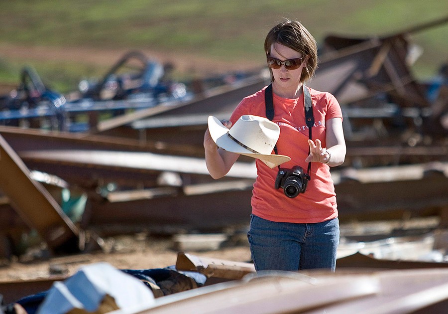 Read moreAlicia Brinley pulls an untouched cowboy hat out of the tornado debris where a horse arena once stood on her family farm at the Misty Creek Ranch in Sanford, North Carolina, Sunday, April 17, 2011. #