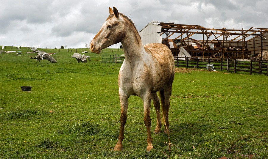 Read moreA horse stands in a pasture surrounded by crumpled metal shorn off a shed, right, by high winds, Saturday, April 16, 2011 in Stuarts Draft, Virginia. Several farm structures were damaged by high winds, and residents suspect that a tornado was responsible. #