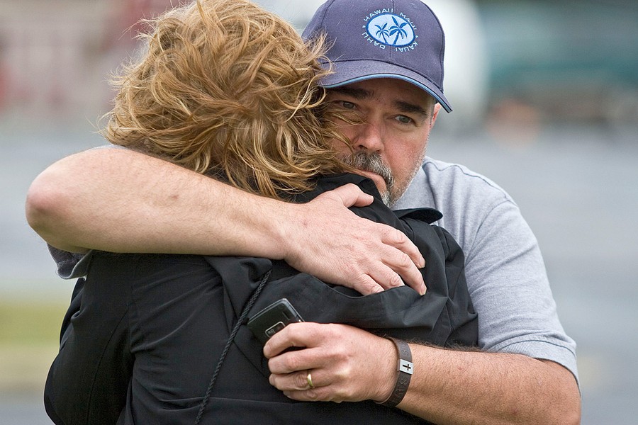 Read moreChris Nelson hugs his daughter Andrea Nelson, 15, in the parking lot in front of Lowe's hardware store in Sanford, North Carolina, on Sunday, April 17, 2011, a day after a tornado destroyed the building while the Nelsons were inside shopping. The Nelsons returned Sunday to reclaim their truck, back right. #