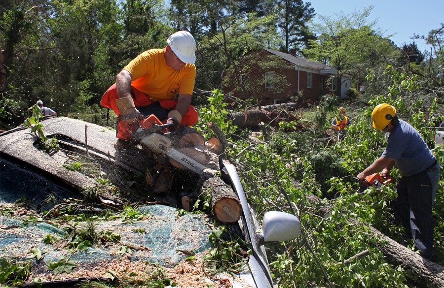 Read moreClint Stanley (left) and Rob Oakley clear away the remains of a tree on top of a car, Sunday, April 17, 2011. The tree fell and crushed the car of Myra Pearson in the driveway of her house on Oleander Road in Raleigh when a tornado struck Raleigh, North Carolina. Saturday, April 16, 2011. #