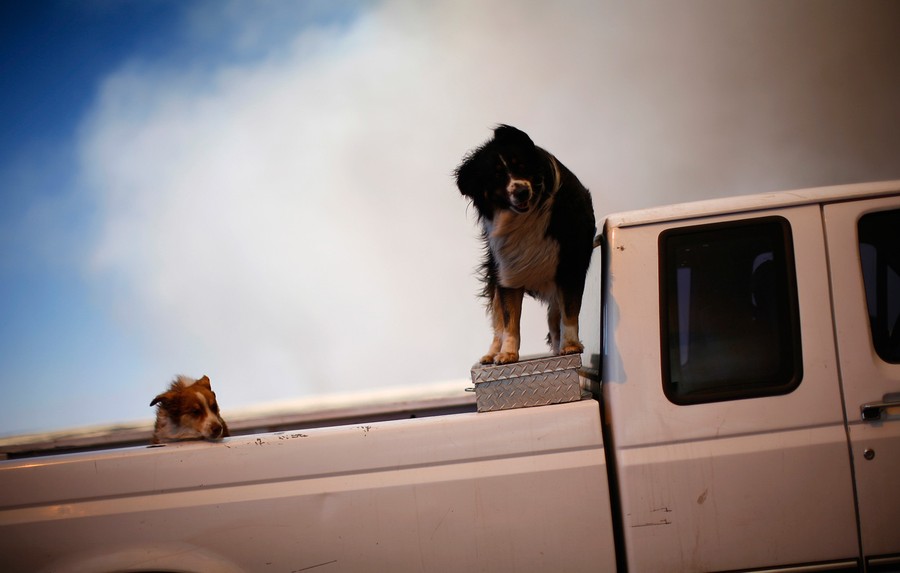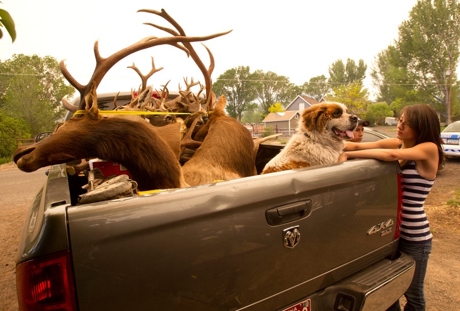 Read moreAlex Verdugo, of Eager, comforts her dog sitting in the back of her father's truck filled with hunting trophies. Her family was evacuating to Show Low from the Wallow Fire. #