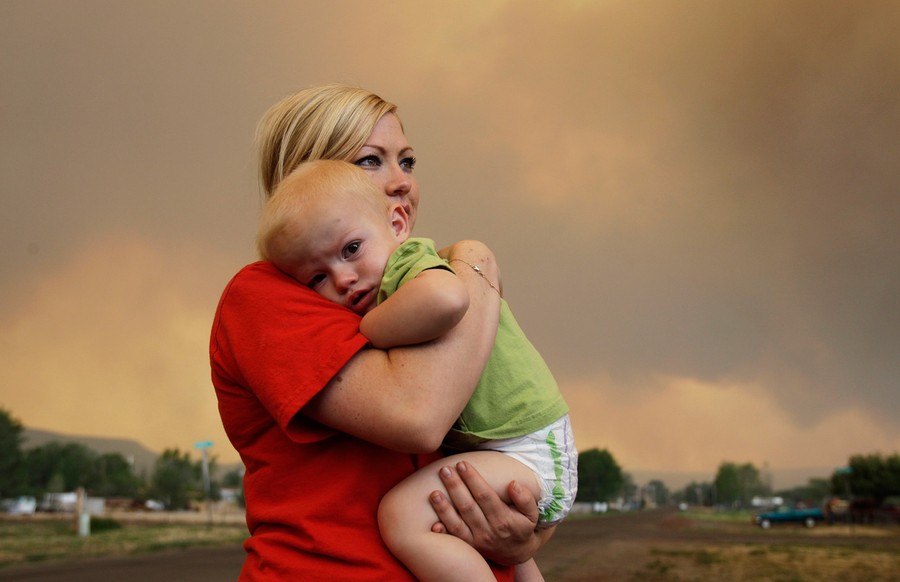 Read moreEmily Shupe comforts her 18-month-old son Jax as the family prepares to evacuate to Phoenix as the Wallow fire approaches Springerville, Arizona, on Tuesday, June 7, 2011. #