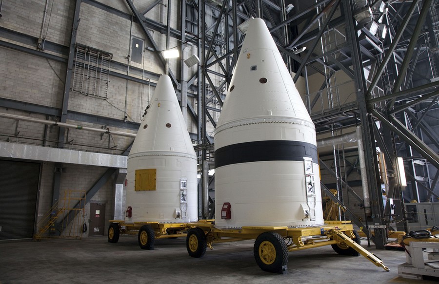 Read moreAt NASA's Kennedy Space Center in Florida, the Space Shuttle Program's final solid rocket booster assembly is stationed in the transfer aisle of the Vehicle Assembly Building. The right and left forward assemblies, which were refurbished and processed at Kennedy, are composed of three components -- nose cap, frustum and forward skirt. Inside the Vehicle Assembly Building, the boosters will be stacked and then joined to an external fuel tank and space shuttle Atlantis for the STS-135 mission to the International Space Station. #