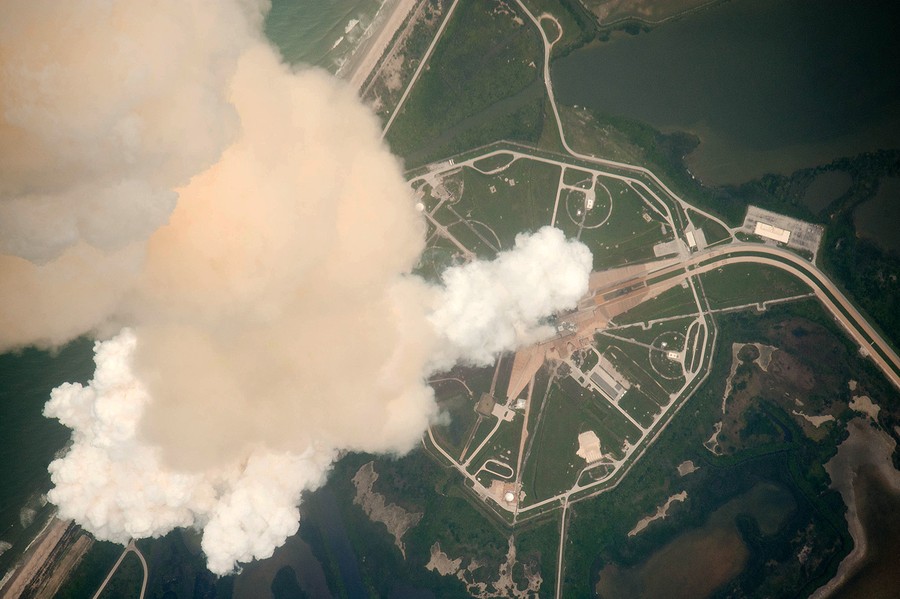 Read moreThe exhaust plume from space shuttle Atlantis viewed through the window of a Shuttle Training Aircraft (STA) after the shuttle lifted off from launch pad 39A at the Kennedy Space Center on Friday, July 8, 2011. #