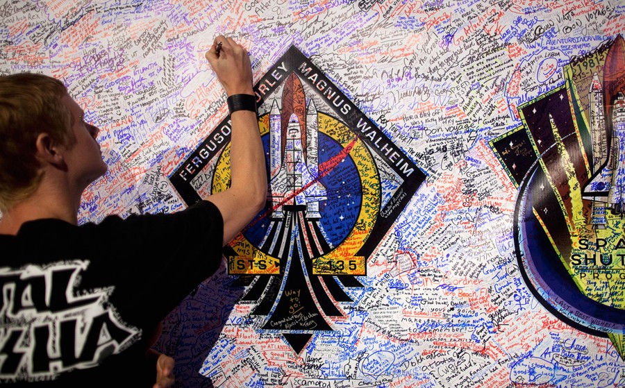 Read moreA man writes his name on a large sign wishing the crew of the space shuttle Atlantis STS-135 well after its lift off from launch pad 39A, at the visitors center of Kennedy Space Center in Cape Canaveral, Florida July 8, 2011. #
