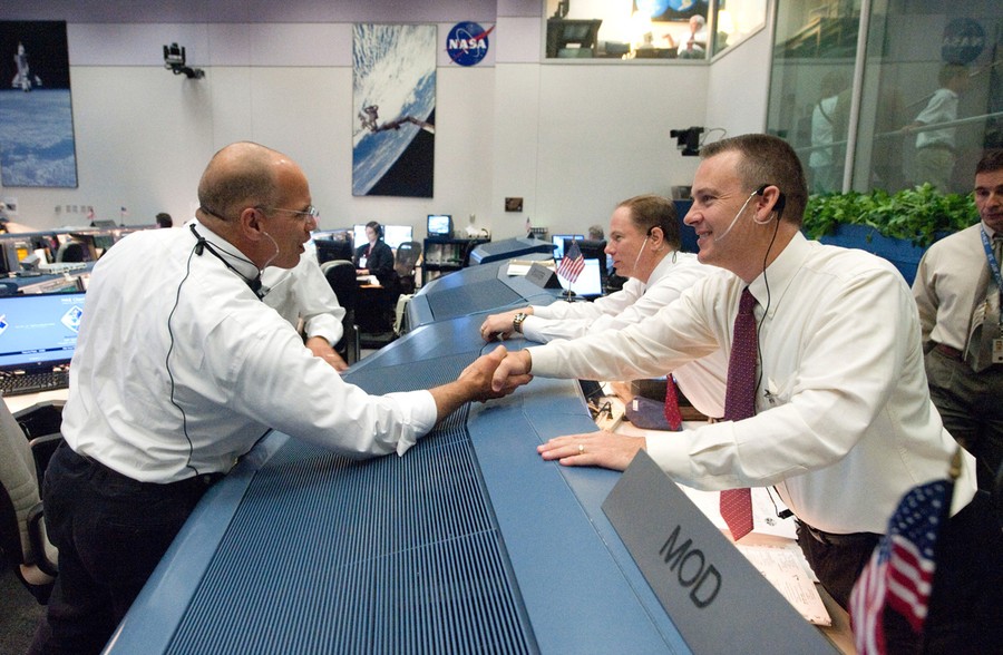 Read moreEntry flight director Tony Ceccacci (left) reaches over a console for a congratulatory hand shake with NASA managers Norm Knight (right) and John McCullough after the successful launch of NASA space shuttle Atlantis at Mission Control Center at Johnson Space Center July 08, 2011 in Houston, Texas. #