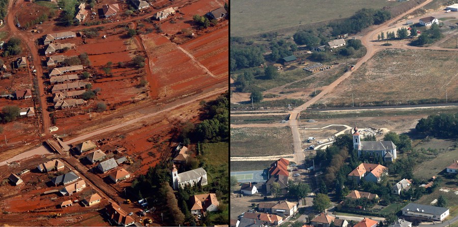 On October 4, 2010, the retaining wall of a caustic waste reservoir at the Ajka alumina plant near Kolontar, Hungary, collapsed, releasing more than one million cubic meters (38 million cubic feet) of highly alkaline red sludge. The thick wave of waste material flooded several nearby villages, killing 10 people, injuring more than 120, and leaving many with chemical burns on their skin. The sludge eventually found its way into local rivers, killing many animals. One year later, damaged buildings have been razed, much of the land has been cleaned up, and MAL Hungarian Aluminum has been fined $647 million (472 million euros) for environmental damages. Today, monitoring shows lower toxicity than many had feared, but the levels are still dangerous. Gathered here are older and recent images from the disaster, including five before-and-after photo pairs (starting with photo number 15) that you can click to see the difference a year can make.