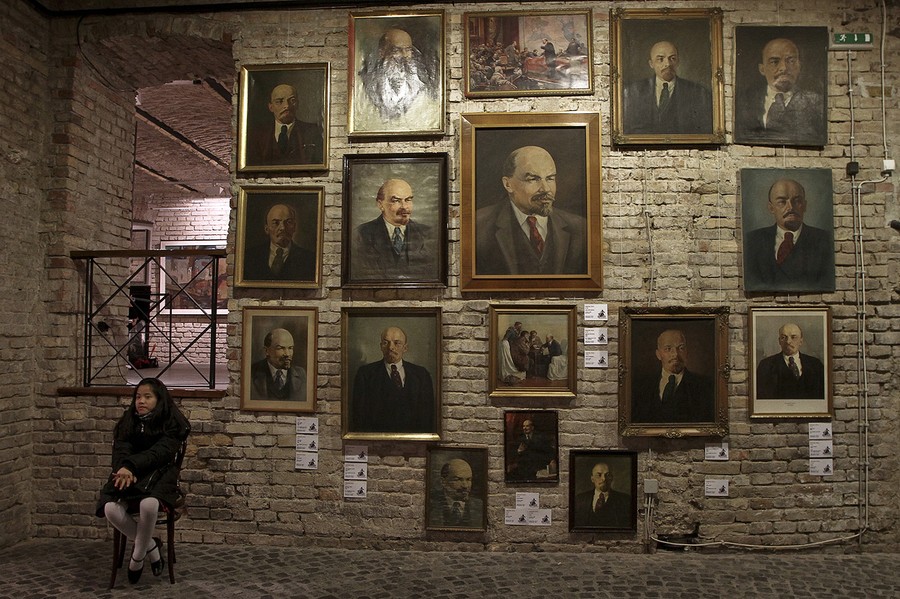 Read moreA girl sits in front of portraits of former Soviet dictator Vladimir Lenin, as 230 Communist-era relics are to be auctioned to benefit the victims of the red sludge flood, on December 6, 2010 in Budapest. #
