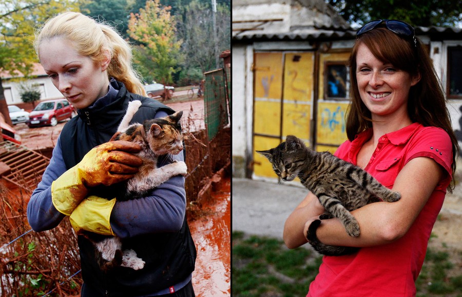 Read moreTunde Erdelyi, rescuing her cat from the wreckage of her home in the town of Devecser, Hungary (at left), on October 5, 2010 and Erdelyi today (right) in the village of Bazsi on September 23, 2011. She now has a new cat because the old cat unfortunately ran under a car only two days after being rescued. #