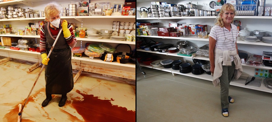 Read moreAt left, shopkeeper Margint Kunos cleans red sludge from her store in the town of Devecser, Hungary, on October 11, 2010 and (right) Kunos, who still works in the same store, on September 23, 2011. #
