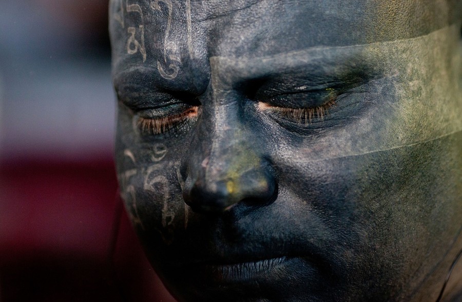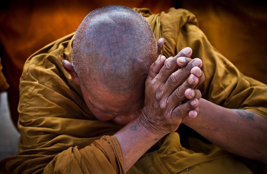 Read moreA Thai Buddhist monk, his head tattooed with sacred religious writings, offers prayers during merit making ceremonies on Sunday, June 19, 2011, to remember those killed in last year's riots in Bangkok, Thailand. #