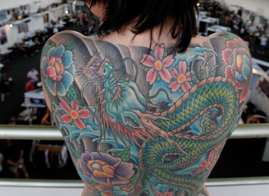 Read moreA visitor displays her tattooed back on a balcony of the exhibition hall during the 13th International Tattoo Convention in the Czech capital Prague, on June 10, 2011 #