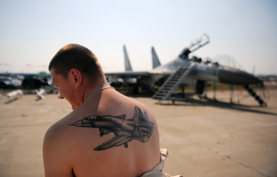 Read moreA Russian specialist shows his tattoo in front of an Su-30 during MAKS-2011, the International Aviation and Space Show, in Zhukovsky, outside Moscow, on August 16, 2011. #