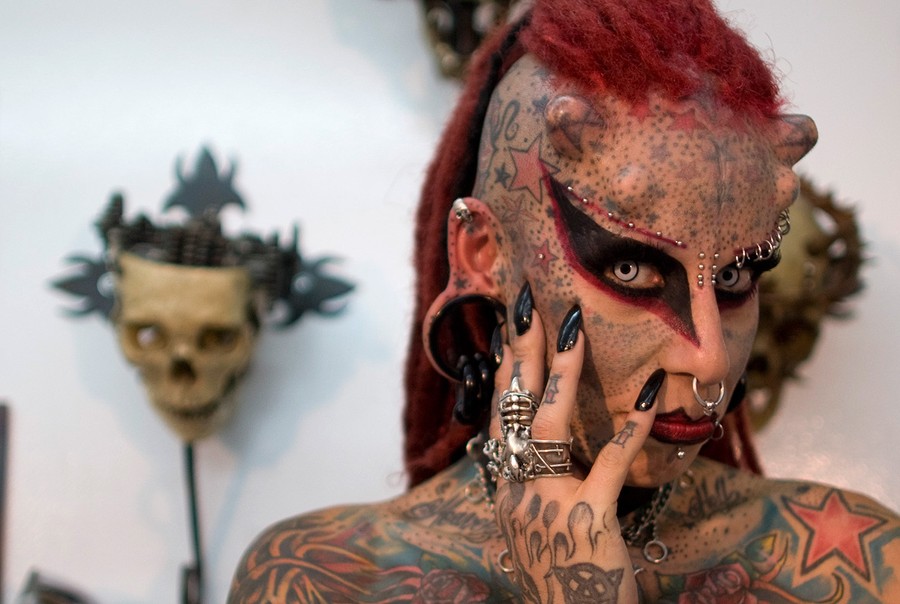 Read moreMaria Jose Cristerna poses for pictures during a press conference at a tattoo shop in Bogota, Colombia, Friday, June 3, 2011. The Mexican tattoo artist said she started to cover her body in tattoos, piercings, titanium implants and dental fangs to re-invent herself as a vampire, her reaction after suffering domestic violence. Cristerna is in Colombia to attend a tattooing international convention. #