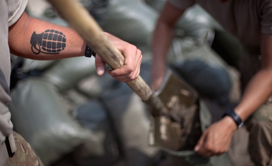 Read moreA tattoo of a grenade decorates the arm of Pfc. Michael Cagle, 20, of San Carlos, California, with the U.S. Army's Bravo Company of the 25th Infantry Division, 3rd Brigade Combat Team, 2nd Battalion 27th Infantry Regiment based in Schofield Barracks, Hawaii, as he fills sandbags on September 7, 2011 at Combat Outpost Monti in Kunar province, Afghanistan. #