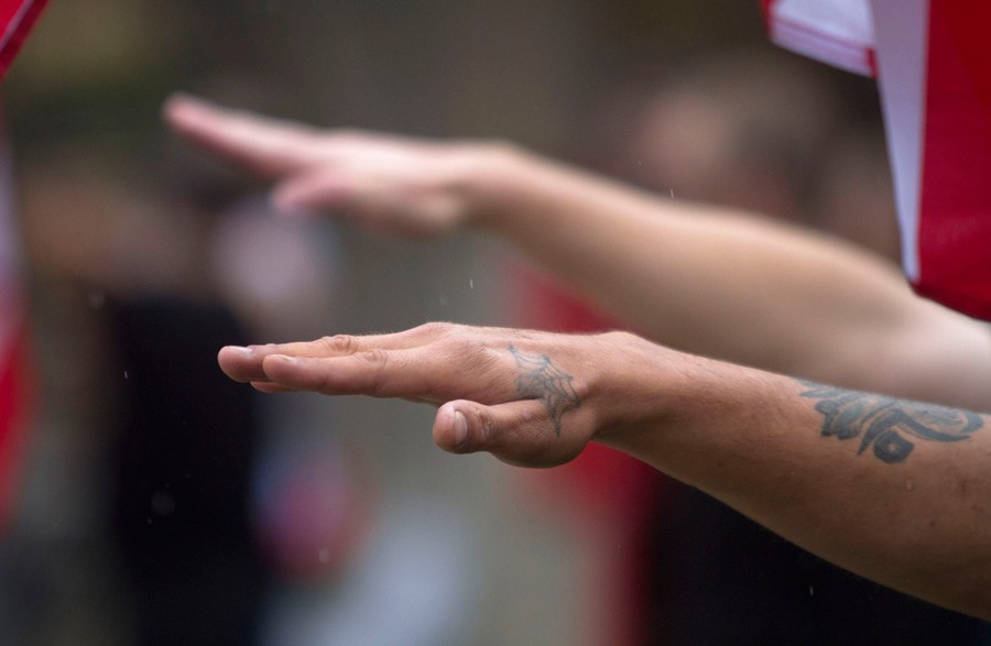 Read moreTattooed hand of a member of a white supremacy group giving a fascist salute during a gathering in West Allis, Wisconsin, September 3, 2011. Neo-Nazi demonstrators gathered for a "rally in defense of white America" in response to an incident that Milwaukee Police Chief described as racially charged violence outside the Wisconsin state fair on August 4, 2011. #