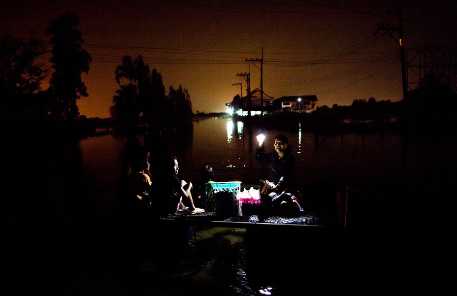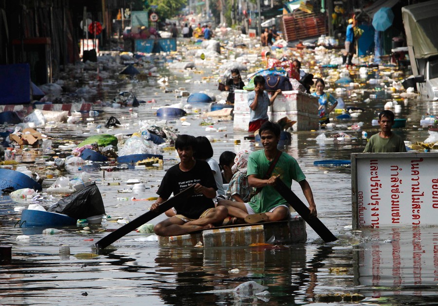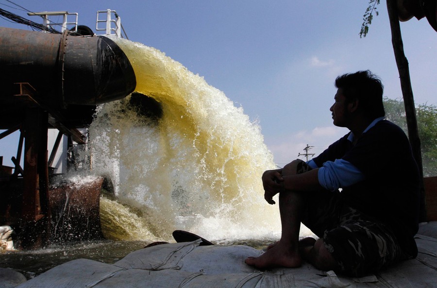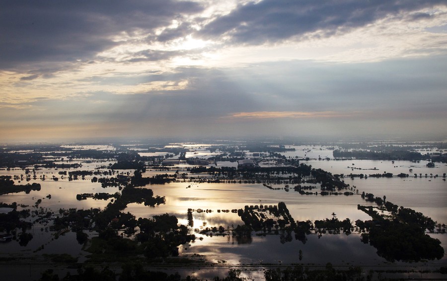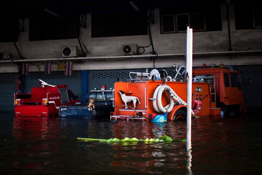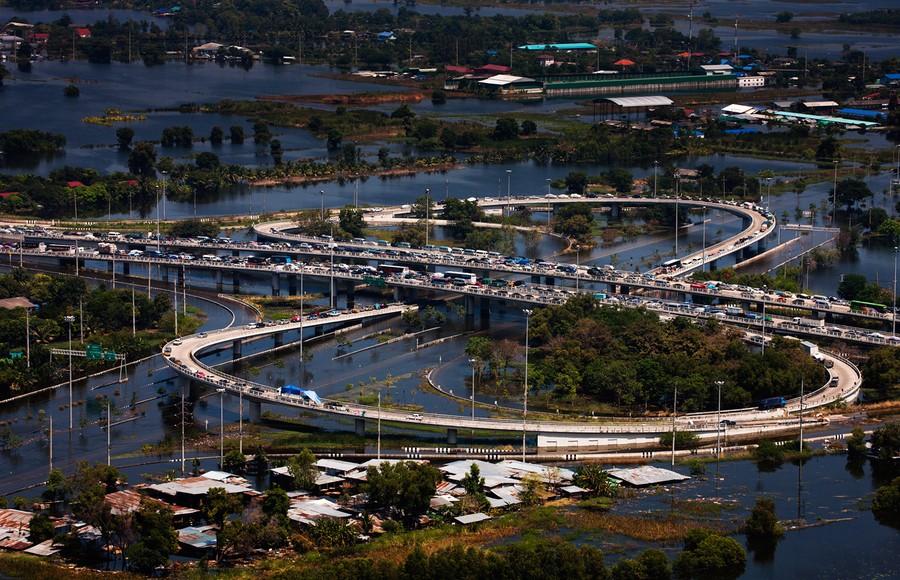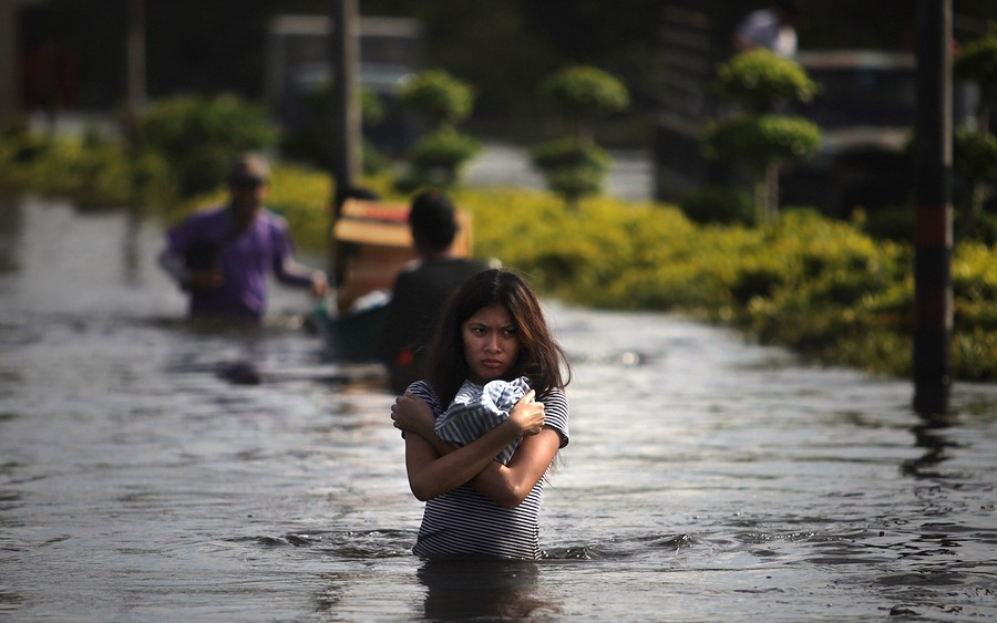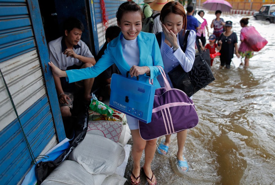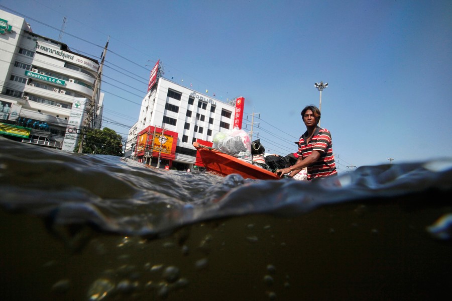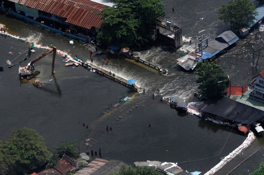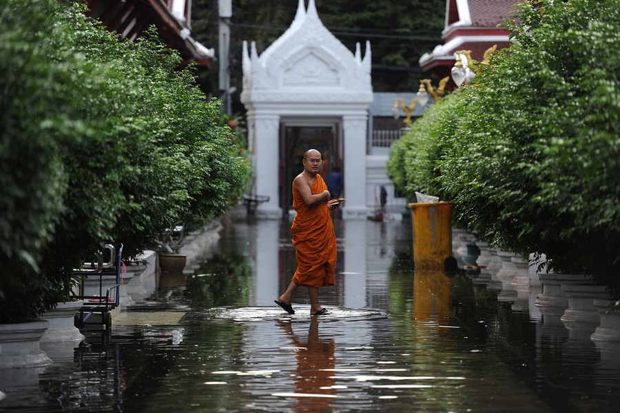 Heavy monsoon rains have been drenching Southeast Asia since mid-July, causing mudslides and widespread flooding. The deluge has now reached Bangkok, with rising water and associated problems affecting most of the city's 10 million residents. Prime Minister Yingluck Shinawatra said that parts of the capital could be inundated by up to 1.5 meters of water and remain flooded for up to a month. Around Bangkok, the second-largest airport has closed, food prices are soaring, clean water is becoming scarce, and the country is declaring a holiday from Thursday until Monday to allow people to evacuate. The Chao Phraya river is predicted to overflow its banks in the city sometime today, and authorities say that if the protective dikes fail to hold the water, all parts of Bangkok will be vulnerable to the floodwater.