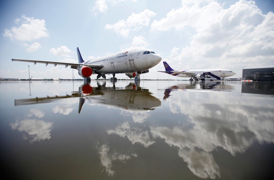 Read moreThai Airways Airbus A300 airplanes sit parked on the flooded tarmac at Don Muang airport in Bangkok, on October 26, 2011. The planes' landing gear has been wrapped in protective plastic. #