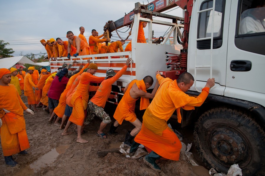 Read moreThai Dhammakaya monks push a truck, stuck in mud, as they work to fortify the flood gate at Khlong Rapi Pat on October 25, 2011 in Khlong Luang on the outskirts of Bangkok, Thailand. #