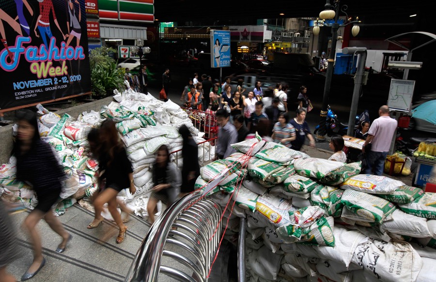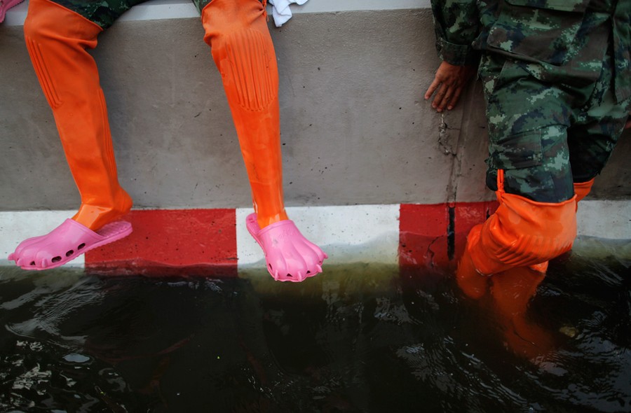 The massive body of water now surrounding Bangkok is continuing its long, destructive trip toward the ocean. The flood is the result of the heavy monsoon rains that drenched Southeast Asia four months ago, leaving Thailand and neighboring countries submerged and claiming more than 1,000 lives across the region. The waters that inundated Ayutthaya to the north of Bangkok have largely receded, but suburbs to the south and west remain under threat, with evacuation notices still being issued. Central Bangkok appears to have been spared the worst of the flooding, due in part to a protective wall of sandbags some 6 km (3.7 mi) long. Throughout the surrounding area, many thousands remain in evacuation centers, or with friends and family, waiting for the worst flooding in decades to recede. Collected here are images from Thailand over the past two weeks.