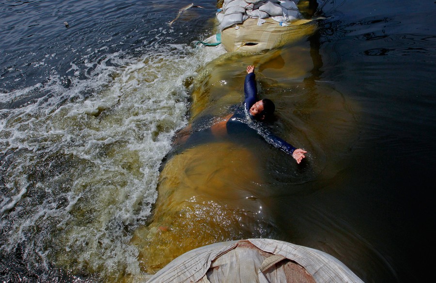 Read moreLocal residents travel in a long tail boat against the current of floodwaters after angry villagers partially destroyed a sand bag wall in front of Don Muang Airport in Bangkok, on November 14, 2011. #
