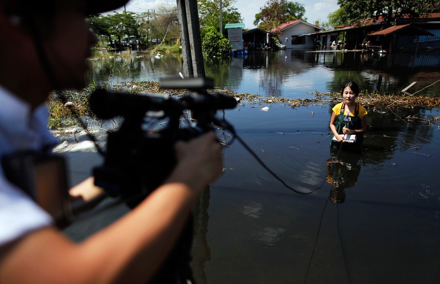 Read moreA reporter for Korean television does a report standing in the water near the Sam Wa flood gate which local residents damaged to let floodwaters flow out of their area toward the city center in Bangkok, on November 2, 2011. Authorities in the Thai capital repaired a damaged flood gate on Wednesday that has become the focus of anger, fear and rivalry between arms of government battling the country's worst floods in decades. #