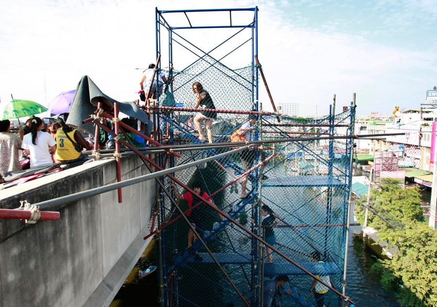 Read moreThai residents climb on makeshift ladders hung from the tollway to a pedestrian overpass over a flooded road in Rangsit district on the outskirts of Bangkok, Thailand, on November 14, 2011. #