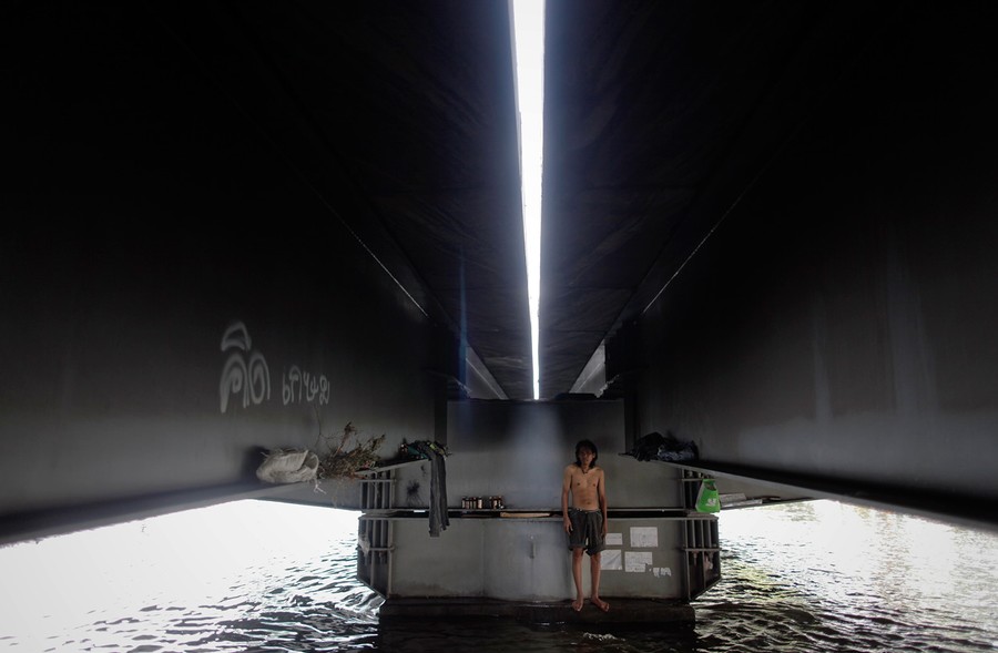 Read moreA Thai boy looks from his shelter of concrete blocks, meant to be used in the construction of an elevated train system, on a flooded road on the outskirts of Bangkok, on November 9, 2011. About 30 families, all victims of the floods, have been living in the blocks since floodwaters hit their village about a month ago. #