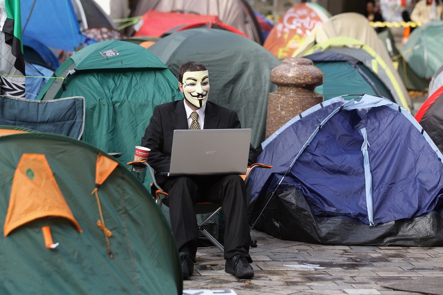 Read moreA mask-wearing protester uses his laptop computer in the Occupy LSX camp outside St Paul's Cathedral, ahead of a demonstration against higher tuition fees and privatization in universities on November 9, 2011 in London, England. Around 4,000 police officers were on duty and were allowed to deploy baton rounds if needed. #
