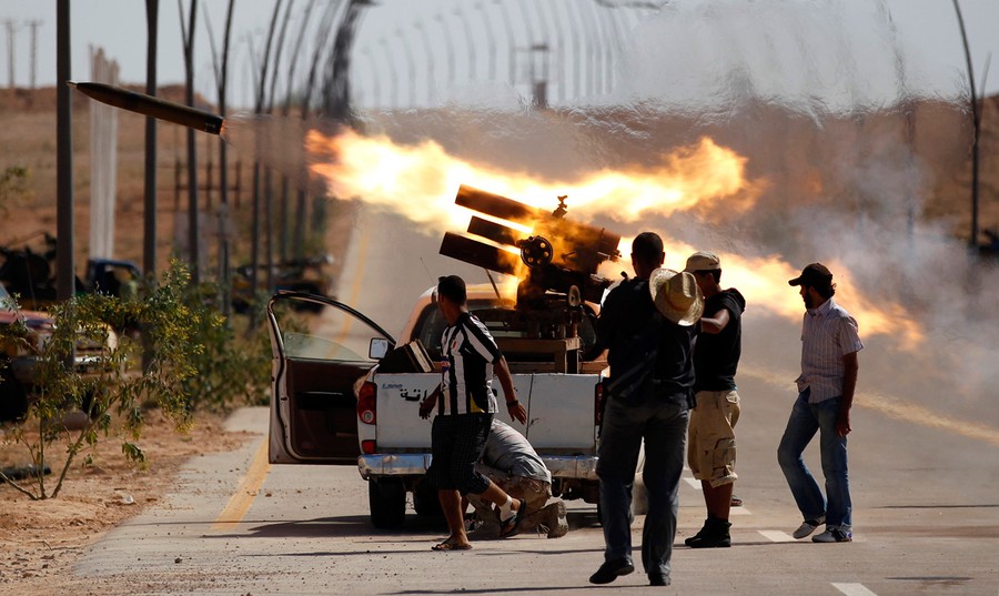Read moreAnti-Qaddafi fighters fire a rocket launcher near Sirte, Libya, one of Muammar Qaddafi's last remaining strongholds, on September 24, 2011. Libyan provisional government forces backed by NATO warplanes swarmed into the city of Sirte on Saturday but weathered heavy sniper fire as they tried to win control of the city. #