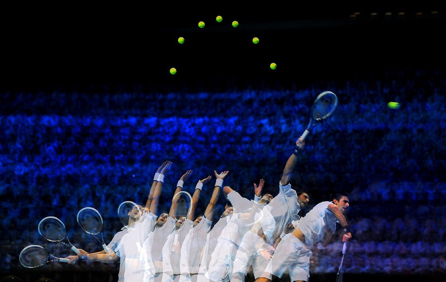 Read moreA multiple-exposure image of Novak Djokovic of Serbia, as he serves during the men's singles match against Janko Tipsarevic of Serbia during the Barclays ATP World Tour Finals at the O2 Arena in London, England, on November 25, 2011. #