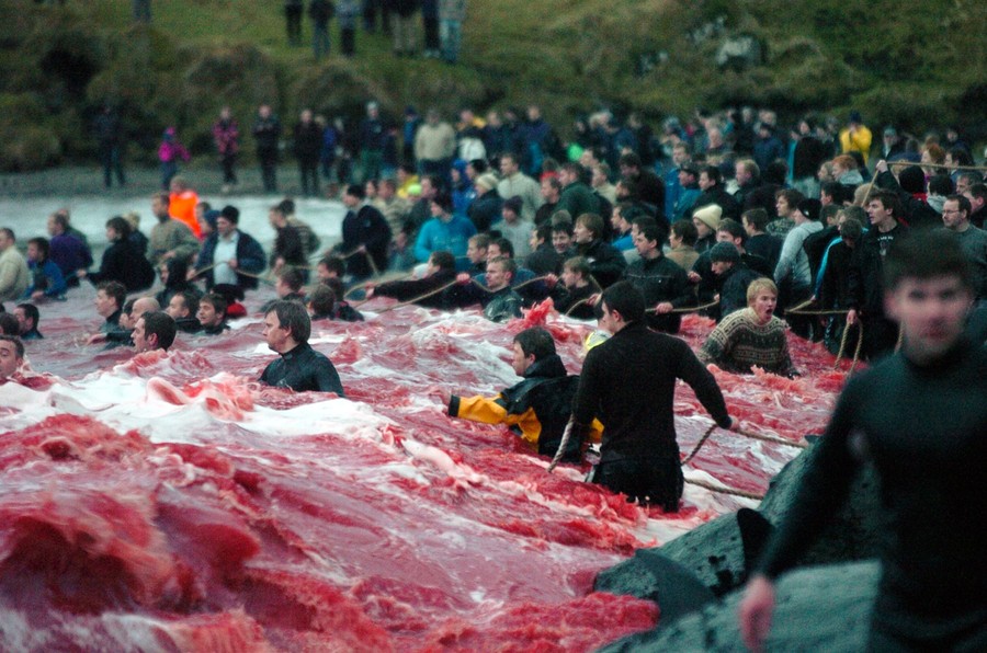 Read moreOcean waves stained red with blood crash ashore as inhabitants of the Faroe Islands catch and slaughter pilot whales (Globicephala melaena) during the traditional "Grindadrap" (whale hunting in Faroese) near the capital Torshavn, on November 22, 2011. The Faroese are descendents of Vikings, and pilot whales have been a central part of their diet for more than 1,000 years. They crowd the animals into a bay and kill them. "Grindadrap" whaling is not done for commercial purposes, the meat can not be sold and is divided evenly between members of the local community. #