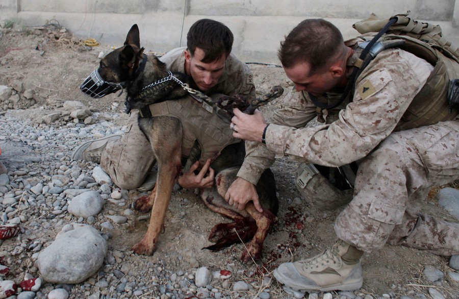 Read moreU.S. Marine dog handler Sgt. Mark Behl, left, of the 3rd Marine Expeditionary Force K9 unit, and another Marine, perform first aid on U.S. Military working dog Drak, after he was wounded in a bomb attack, in Sangin, Helmand province, Afghanistan on September 8, 2011. Drak's own handler, Sgt Kenneth A. Fischer, was also wounded in the bomb attack, which also killed several civilians. Both Fischer and Drak were flown out of the country for surgery and recovery. Eventually, in line with military custom, Fischer will adopt Drak and take him home. #