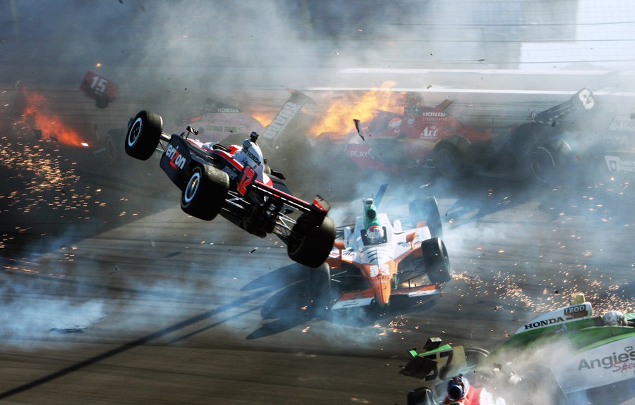 Read moreThe race car of driver Will Power (left) goes airborne during a multiple-car crash at the IZOD IndyCar World Championship race at the Las Vegas Motor Speedway in Las Vegas, Nevada, on October 16, 2011. The motor racing world was left reeling from the death of time-two Indianapolis 500 champion Dan Wheldon, who was killed in the crash, as the season-ending celebration turned to disaster. #