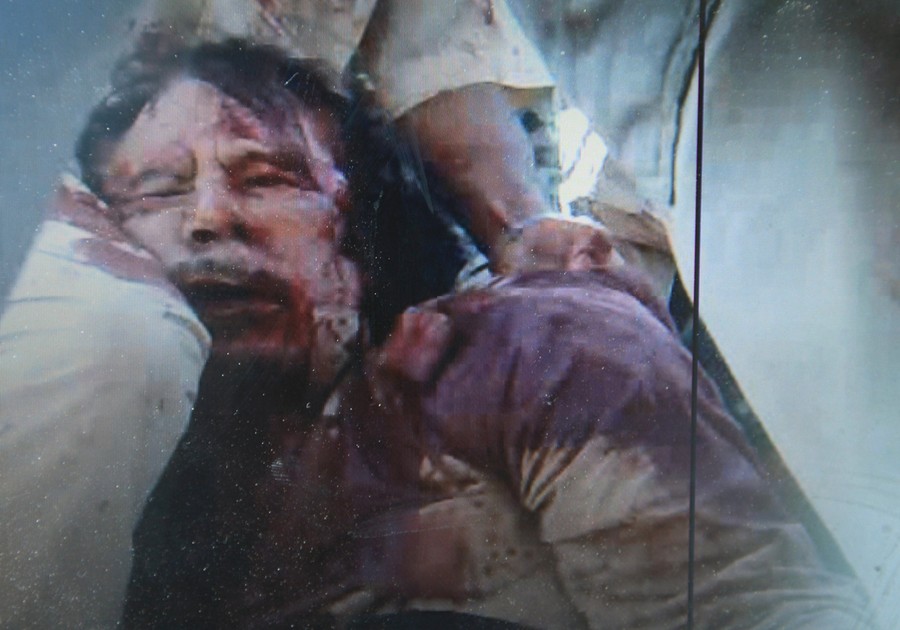Click to view imageRead moreBloodied Former Libyan leader Muammar Qaddafi is seen in this still image taken from video footage in Sirte, Libya, on October 20, 2011. Qaddafi was killed as Libya's new leaders declared they had overrun the last bastion of his long rule, sparking wild celebrations that eight months of war was finally over. NATO aircraft had fired on a convoy of vehicles carrying Qaddafi and other loyalists, damaging and destroying several vehicles. Qaddafi escaped the airstrike, but was soon captured alive by rebel forces on the ground, who found him hiding in a drainage pipe. Multiple videos and photos showed the former dictator bleeding and being roughly handled. Shortly after, he was dead - the exact circumstance of his death remains uncertain. His body was put on display for the public to view in a freezer in Misrata for several days afterward. He was then buried in an undisclosed location in the desert. #
